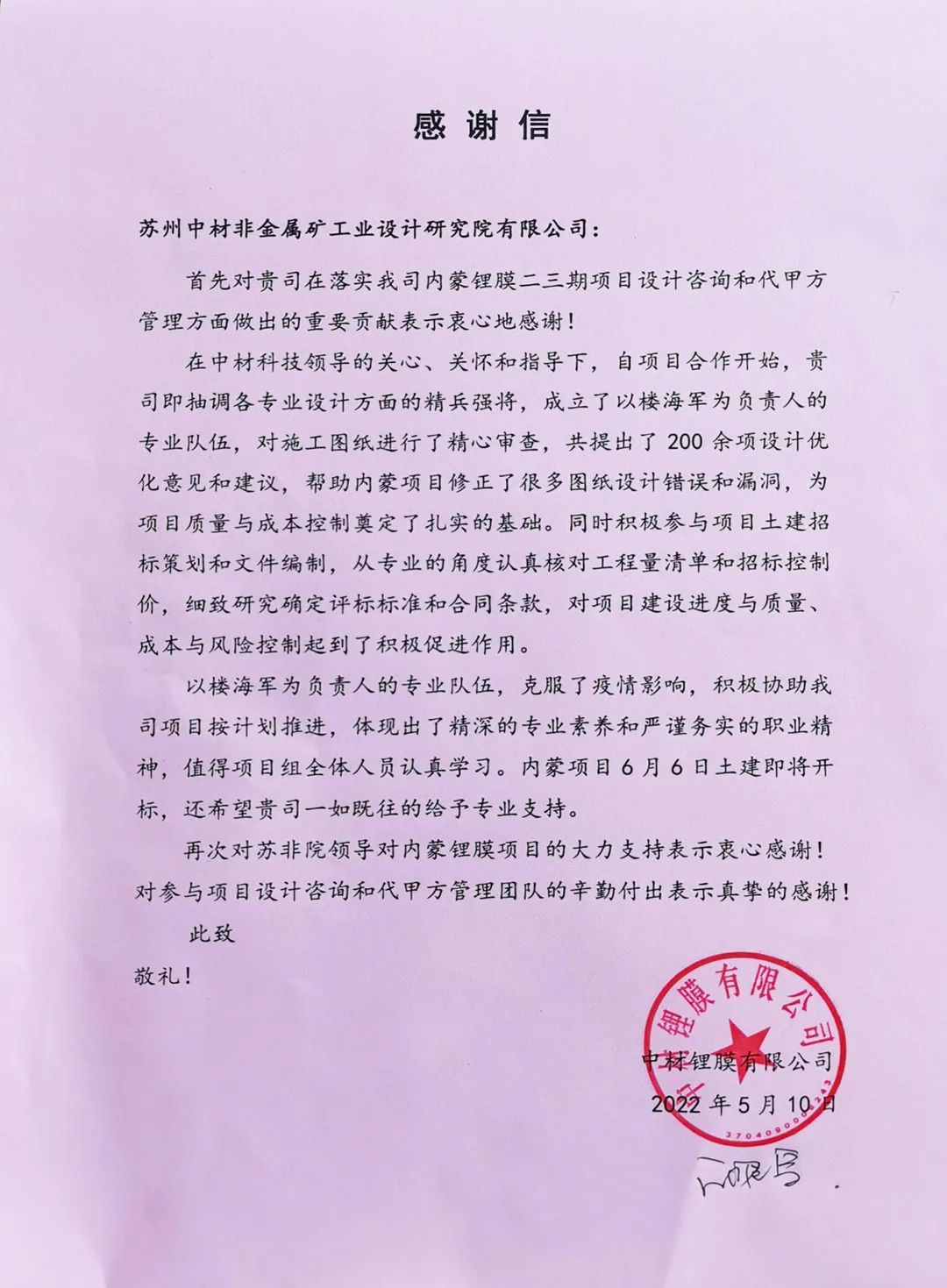 近日,蘇州非礦院收到中材鋰膜有限公司發(fā)來的感謝信。信中指出:由內(nèi)蒙鋰膜承建的“年產(chǎn)1.6億平方米鋰電......